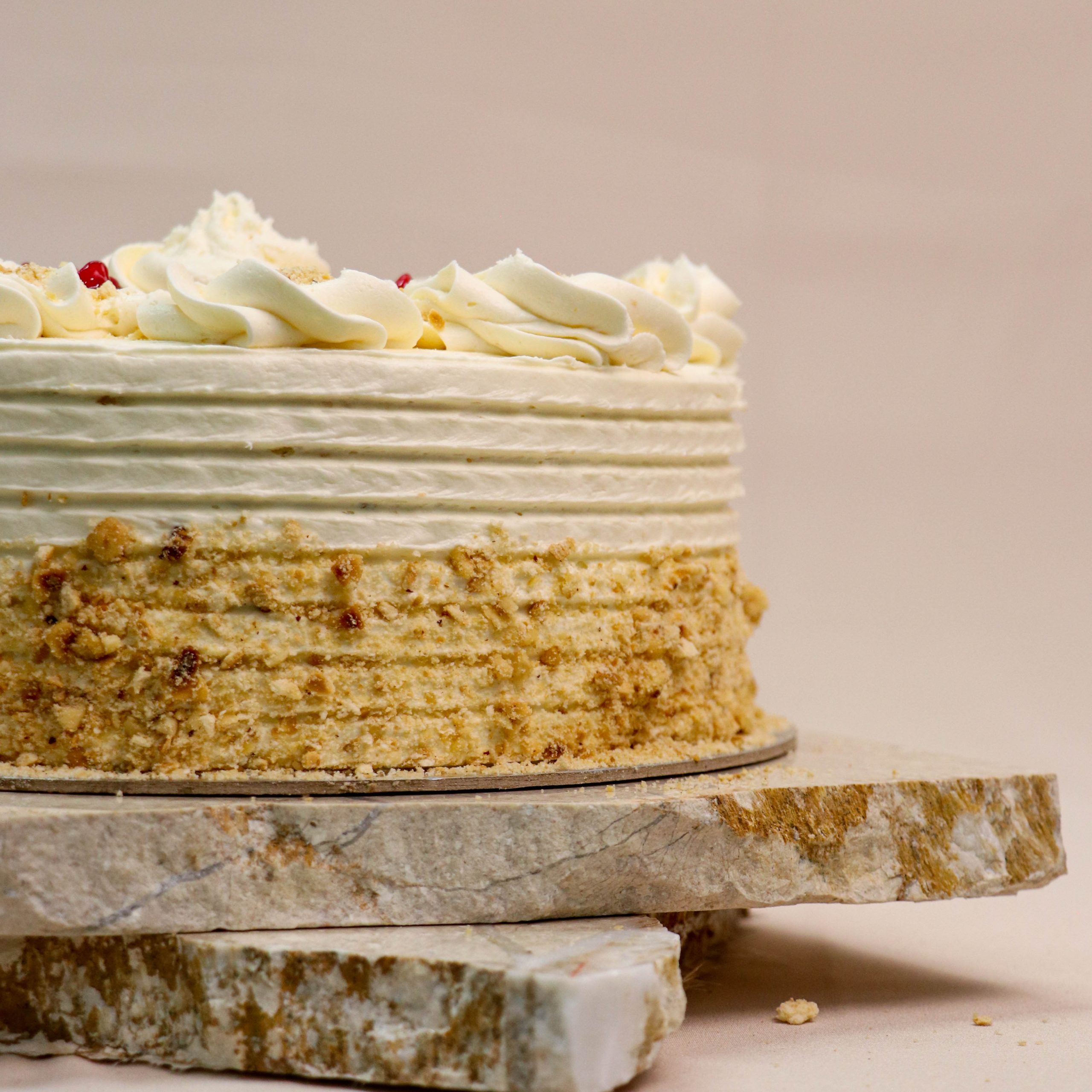 Двослојниот пандишпан е посебно испечен за секој слој, што го прави мекиот и богат текстурален контраст со кремот. Но, тоа не е сѐ – додавањето на ореви во секој слој носи природна крцкавост која создава баланс помеѓу мекиот и крцкавиот дел на тортата.