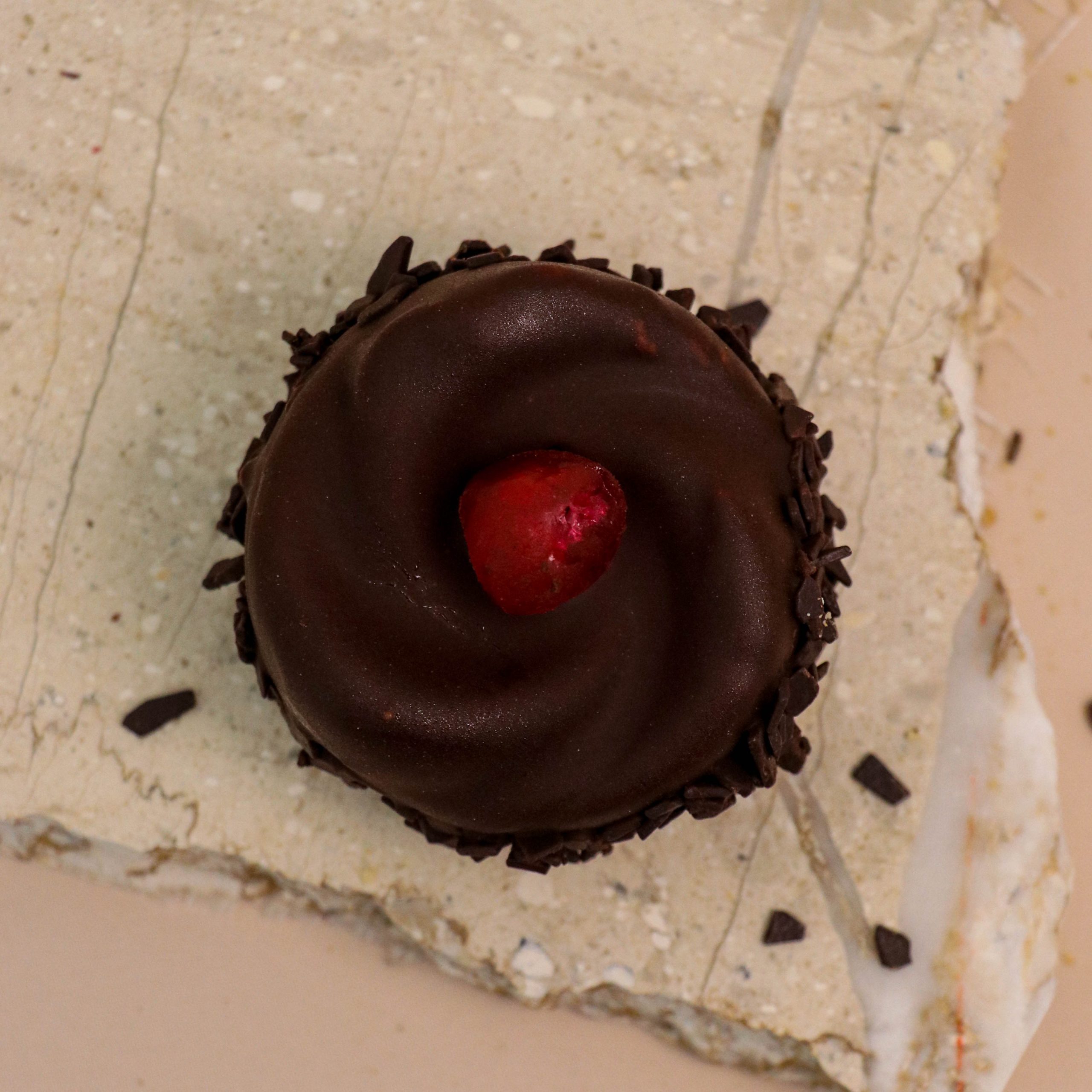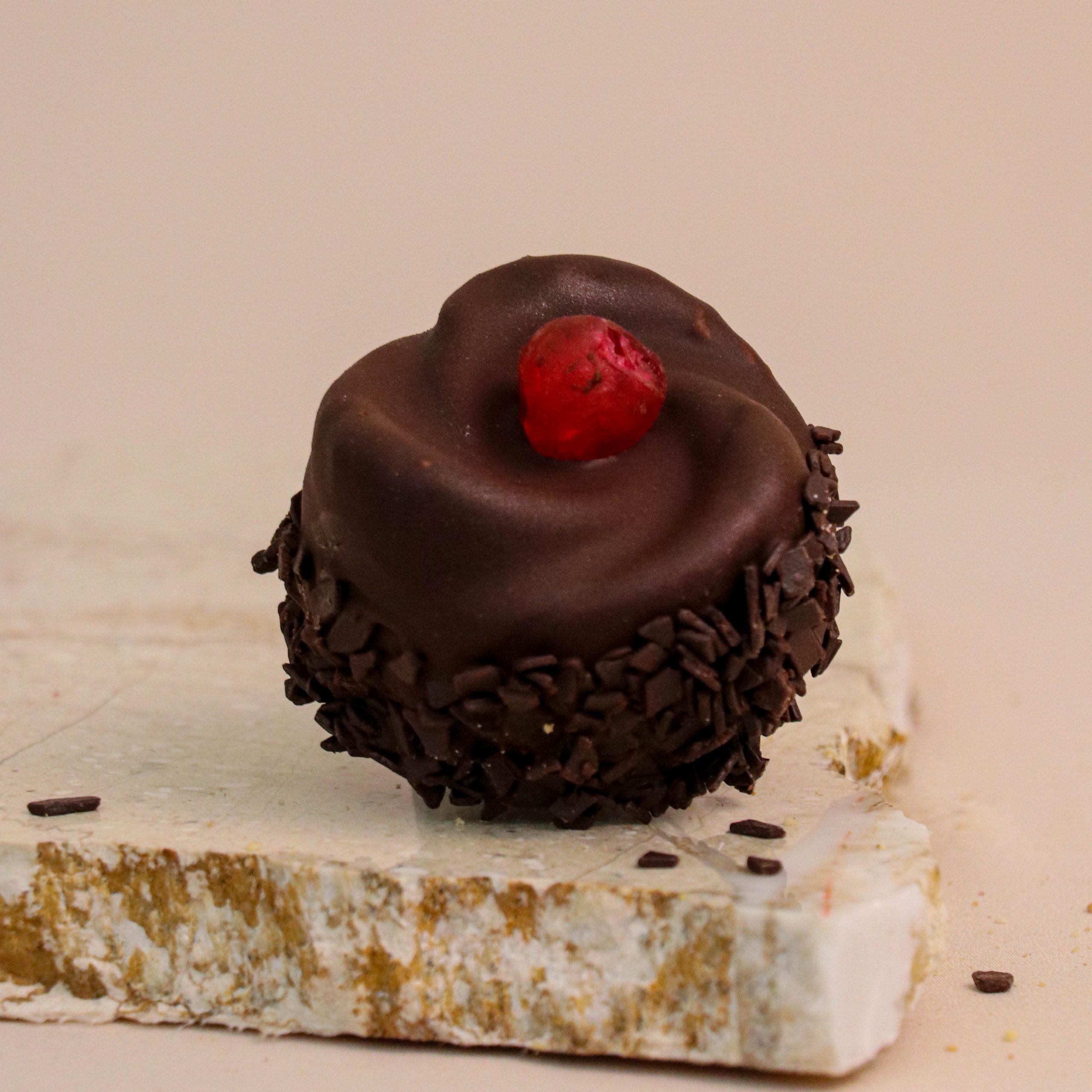На врвот, десертот е прелиен со црно млечно чоколадо кое се топи во устата, а финалниот допир го даваат декорирани парчиња вишна – визуелно и вкусовно задоволство.